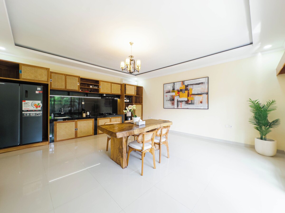 The open-plan living and dining area provides the perfect setting for quality family time—whether you’re having breakfast together, planning the day’s activities, or simply relaxing after exploring Bali. Step outside to your private swimming pool surrounded by tropical greenery, offering a safe and refreshing space for kids and adults to enjoy.